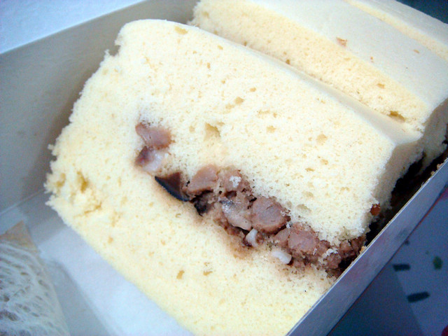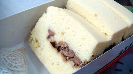 哇!外層軟軟微甜,類似海綿蛋糕,而中心夾著鹹鹹的肉燥,哈!還真是特別耶!