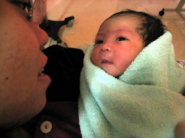 小 baby 似乎是被吵醒了,張開了小小的眼睛。