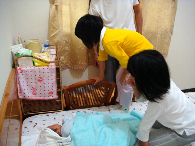 這兩位小姐姐對這小小孩可是好奇極了,爬到床上要看看他的模樣!