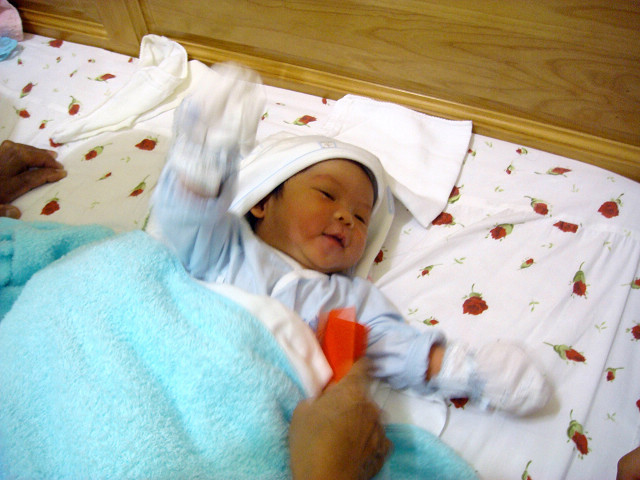 大伙這裡看看、又那裡瞧瞧,把小 baby 給吵醒了啦,看他手足舞蹈地起床了!