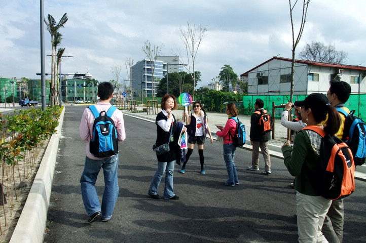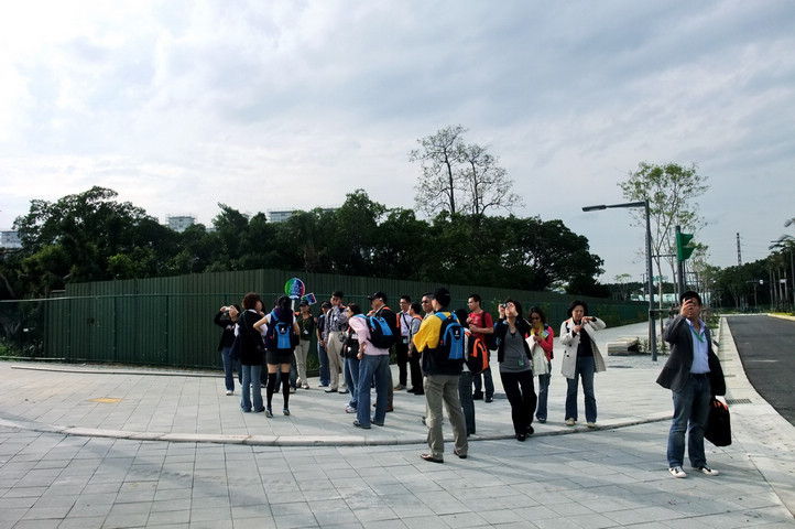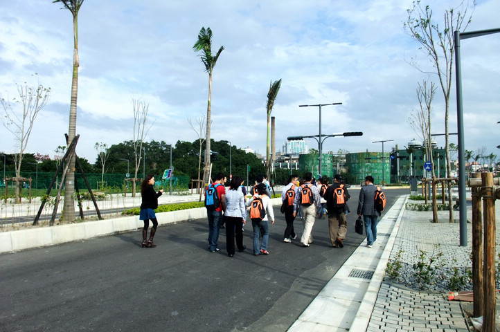 寬敞的園區人行道,可以同時容納一堆人趕上班。 x-D