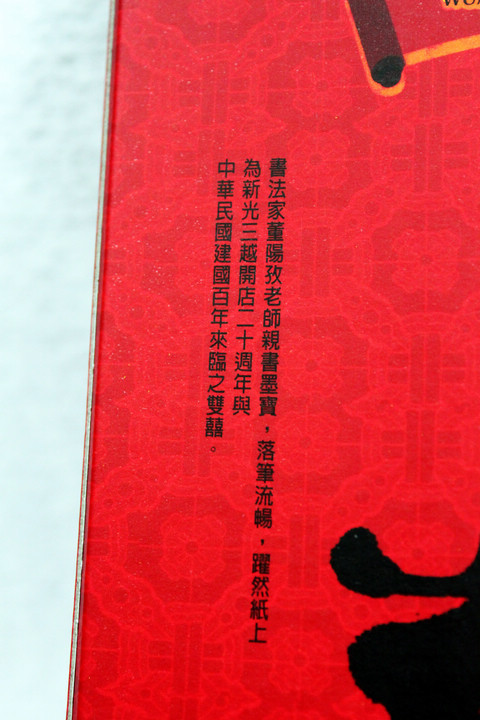 外包裝上有個大大的雙喜,一喜是建國百年、二喜是新光三越二十周年,
