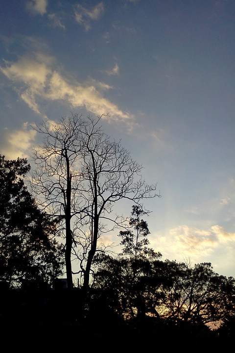 人行道旁的無葉老樹在落日餘暉下有蒼茫寂涼的感覺,