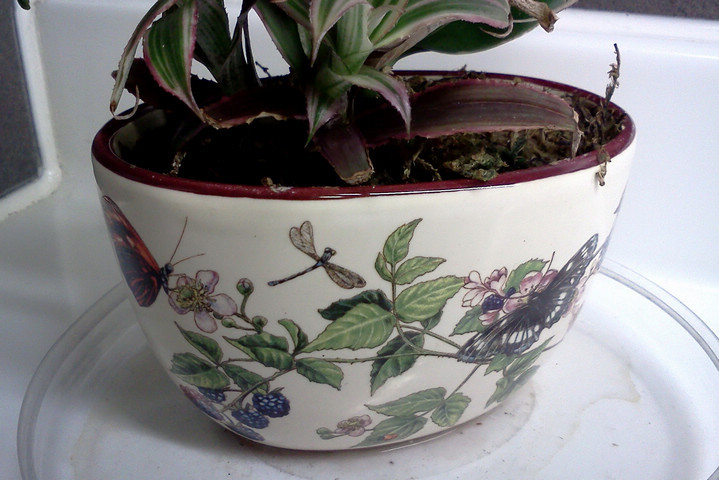 白色花卉昆蟲小瓷盆配上紫色的葉子,有高雅清新的感覺,