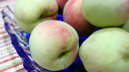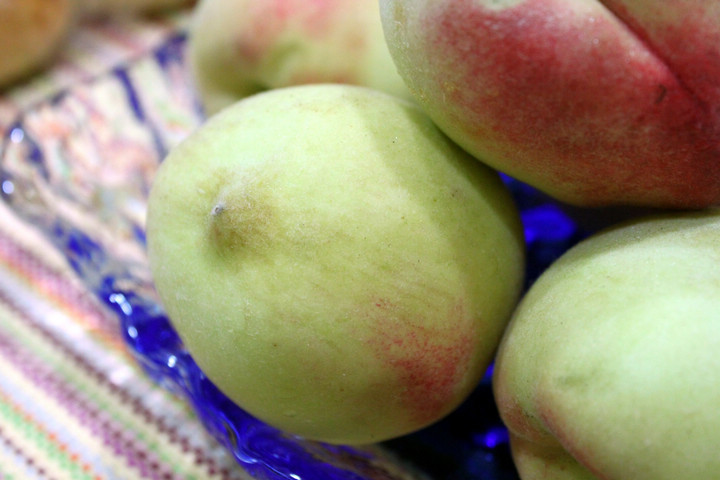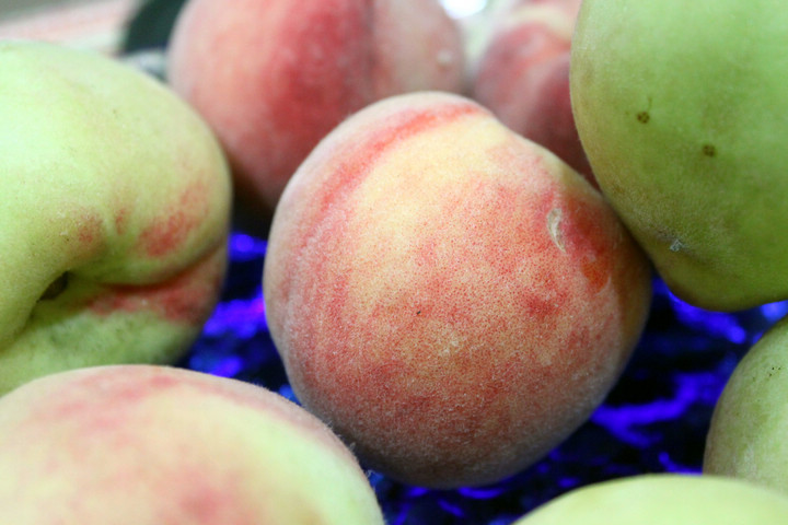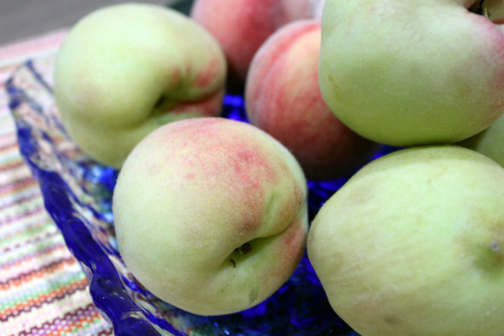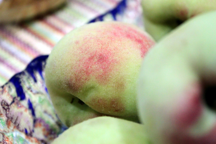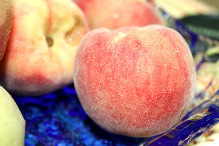 小小的桃子很可愛,放在藍色的玻璃盤上,更顯現出它的粉嫩。
