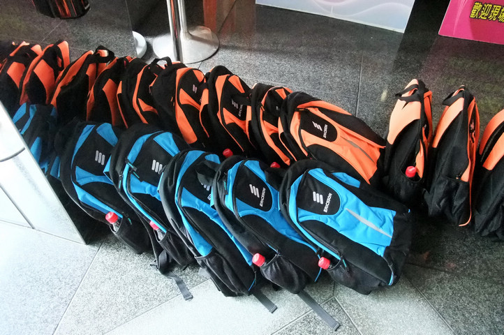 已經有工作人員在現場等待,一整排的背袋看來很壯觀啊!